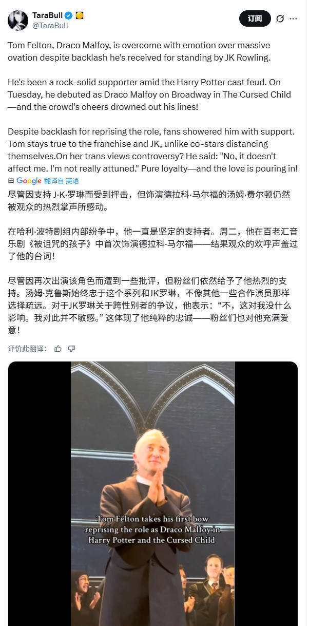 Tom Felton尽管因支持J.K.罗琳而遭受争议,却在舞台上被观众的热烈掌声感动得几乎说不出话。